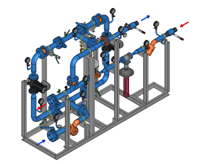 Стандартный насосный узел смешения с трехходовым регулирующим клапаном, регулятором перепада давления и резервом насосов 2х100% для управления системами отопления и вентиляции